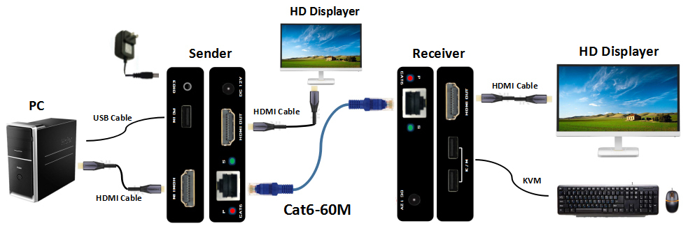 · Uncompressed transmits HDMI video and audio signals up to 60M over a single CAT6 cable;