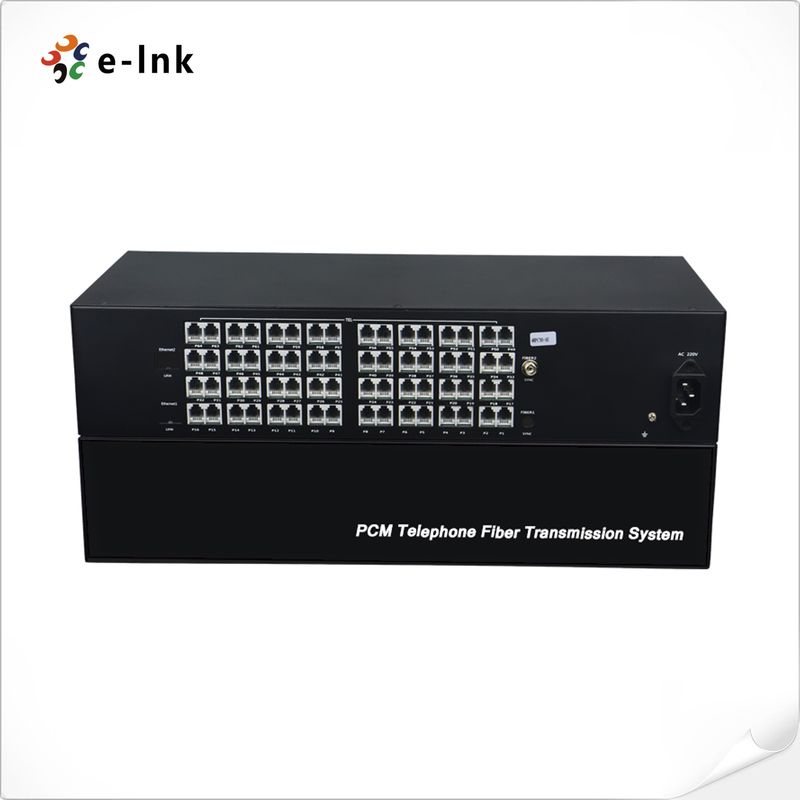 E-link 64 saluran POTS (Plain Old Telephone System) saluran telepon melalui konverter / extender serat. Konverter Voice over Fiber ini menggunakan konektor modular RJ-11C untuk setiap koneksi pasangan tembaga. Unit tipe FXO terhubung ke saluran telepon (PSTN) atau saluran stasiun PBX dan memiliki kemampuan untuk mendeteksi tegangan dering dan bertindak sebagai telepon. Unit tipe FXS adalah unit timbal balik dan memiliki kemampuan untuk bertindak sebagai PSTN dan terhubung ke perangkat telepon.